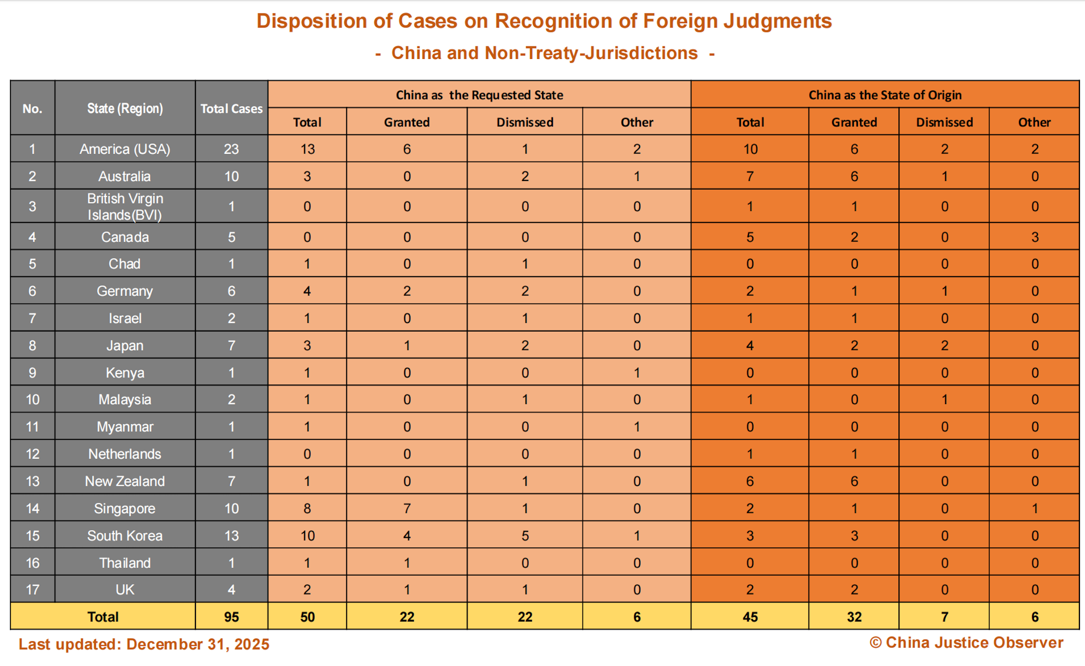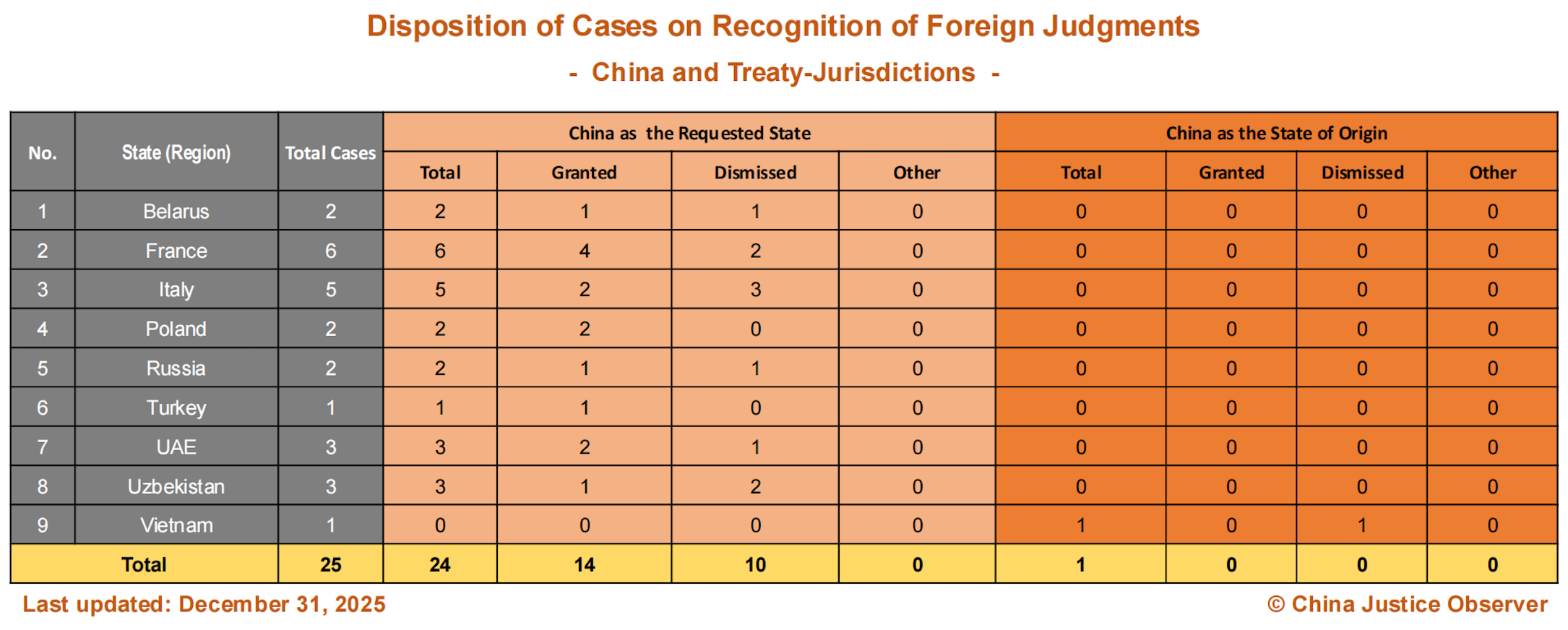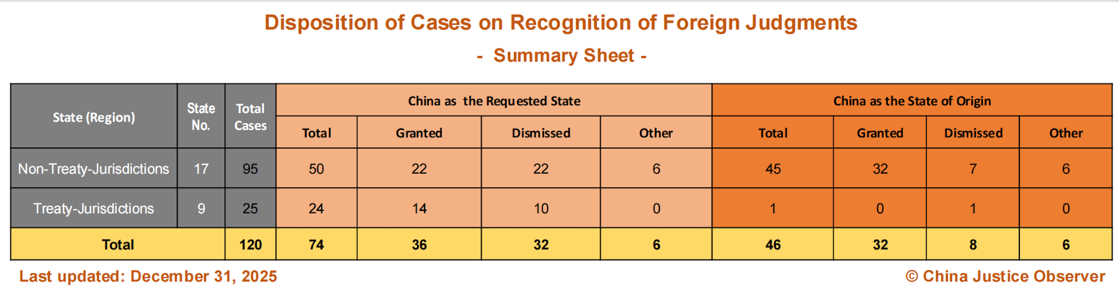 On 31 December 2025, China Justice Observer released the 2025 version of the List of China’s Cases on Recognition of Foreign Judgments. To date, we have collected 120 cases involving China and 26 foreign States and regions. (Note: Foreign divorce judgments are excluded in the Case List.)
