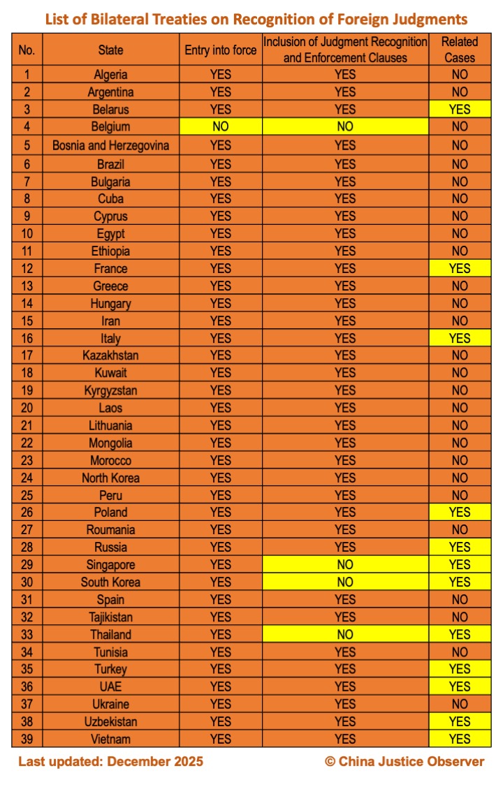 - The List comprises 26 concise reports for each jurisdiction, together with a chart of bilateral judicial assistance treaties which China has concluded with 39 States, of which 35 bilateral treaties include judgment enforcement clauses.